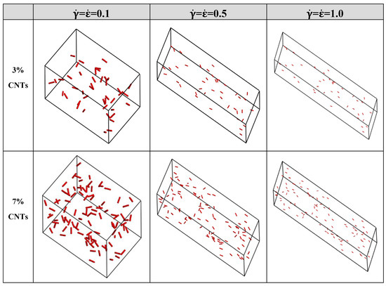 In this simulation, the Souza-Martins method is performed for driving the extensional-shear coupled flow field, by combining the simple extensional flow field and the simple shear flow field. To describe the orientation and dispersion evolution of CNTs (10%) in UHMWPE under extensional-shear coupled flow, morphological structure evolution under a low, moderate, and high extensional-shear coupled rates (0.1, 0.5 and 1.0) are calculated, where the extensional-shear coupled rate is composed of shear rate and extensional rate , = in the current paper. The typical simulation results are illustrated in Figure 2. To observe the CNTs morphology clearly, beads of PE are not displayed in this study and beads of CNTs are displayed in CPK style with CPK scale of 2.5 (CPK style indicates that atoms are rendered as spheres with radii that are related to the radii of the beads). These results confirm that the final states of the orientation is highly dependent on the extensional-shear coupled rate. When at a low coupled rate (i.e., 0.1), CNTs tend to form disordered morphology. By increasing the coupled rate, CNTs tend to align along the elongated direction. In the case of a high coupled rate (1.0), the ordering alignment is noticeable. However, an increment of extensional-shear coupled rate yields less effect on the dispersion of CNTs in UHMWPE. This means that the higher extensional-shear coupled rate does not necessarily contribute to much better dispersion.