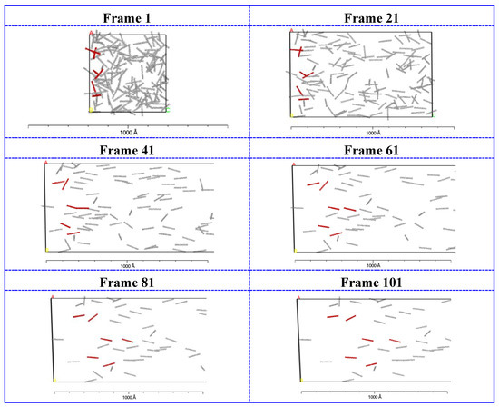 Simulation snapshots of CNTs/UHMWPE composites at 10% CNTs, obtained with a coupled rate of 1.0. The snapshots are taken every 2 × 104 timesteps.