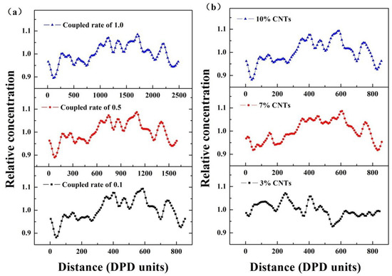 Figure 6 demonstrates the relative concentration distribution functions of CNTs in CNTs/UHMWPE composites corresponding to the morphologies in Figure 2 and Figure 3. The relative concentration is given by the ratio of concentration of a type of bead in the slab to its average concentration across the entire system. By comparing the number and magnitude of the peak values existing in the relative concentration distribution functions, the dispersion state can be indirectly evaluated. The fewer peaks and the smaller the peaks are, more uniform the dispersion presents in CNTs/UHMWPE composites. As seen in Figure 6a, it is clear that the relative concentration evolution is similar even though extensional-shear coupled rate varies, which suggests that the higher extensional-shear coupled rate does not necessarily contribute to much better dispersion, consistent with the above results from morphologies in Figure 2 and Figure 3. Judging from Figure 6b, it can be concluded that the dispersion of CNTs in UHMWPE is slightly impacted by CNTs concentration because they are uniformly dispersed for the systems below 10% CNTs.
