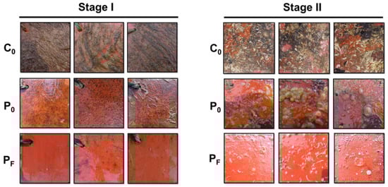 Images of the tested steel substrates coated with different coatings (i.e., C0, P0 and PF surfaces) immersed in the natural seawater at different exposure times. Stage I: Oct.19, 2013-Mar.18, 2014, 150 days; Stage II: Mar.25, 2014-July.13, 2014,110 days.