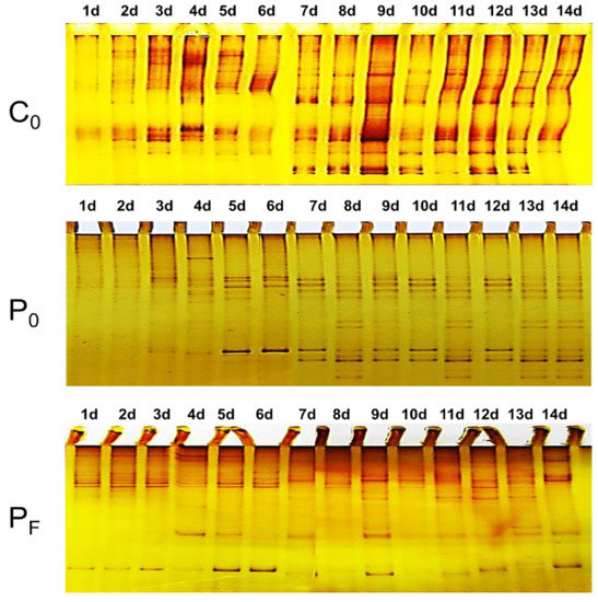 Figure 3 showed the differential SSCP fingerprints of the pioneer biofilm-forming eukaryotes on the C0, P0 and PF surfaces during the two-week submergence. As observed from the eukaryotic SSCP fingerprints, the pioneer eukaryotes gradually increased and evolved similar successional patterns on the same type of coating surfaces as a function of time. However, significant differences in the eukaryotic SSCP profiles can be observed and screened among different protective coatings. This suggested the C0, P0 and PF surfaces have showed differential perturbation effects on the pioneer eukaryotic microbial colonization.