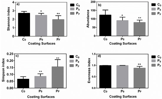 According to the eukaryotic SSCP profiles, the ecological indices were calculated as presented in Figure 4, which were applied as estimators for further evaluation of the dynamic variations within different pioneer eukaryotic biofilm communities among different protective coating surfaces. In Figure 4a,b, it was clear that the value of the Shannon diversity index and Abundance for the early eukaryotic microbial communities colonized on the C0 surfaces (2.71 ± 0.21 and 123 ± 30) were significantly higher than that on the P0 surfaces (2.48 ± 0.22 and 91 ± 19) (P < 0.05, ANOVA) and PF surfaces (1.97 ± 0.45 and 79 ± 14), significantly on the PF surfaces (P < 0.01, ANOVA). These combined results indicated that the early eukaryotic microbial diversity and abundance of communities on the PDMS-based coating surfaces (i.e., coating P0 and PF) were dramatically lower than that on the C0 surface during the two-week submergence. This indicated that the C0, P0 and PF surfaces have demonstrated differential modulating effects on the initial settlement and attachment of the pioneer eukaryotic microorganisms, which may be contributable to accounting for their differential AF performances in the field exposure assays. This remarkably reduced diversity and abundance level suggested that the initial colonization dynamics of early eukaryotic biofilm-forming microbes was greatly perturbed by the PDMS-based coatings, particularly by the PF surfaces. However, this perturbation effect remained relatively weak for the P0 and C0 surfaces, particularly for the C0 surfaces.