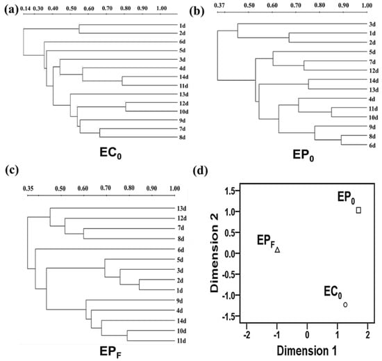 Figure 5 showed different clustering patterns of the early-adherent eukaryotic communities on the C0, P0 and PF surfaces constructed using the UPGMA method (i.e., EC0, EP0 and EPF, see Figure 5a–c) and MDS method (see Figure 5d), respectively. In Figure 5a (EC0), it can be seen that most the pioneer eukaryotic biofilm samples, namely samples taken from day 3 to day 14, were liable to cluster into one group, while only two samples taken from day 1 and day 2 tended to cluster into the other group. In Figure 5b (EP0), the majority of the biofilm samples taken from day 4 to day 14 were liable to cluster into one group, while only a few samples taken from day 1 to day 3 clustered into the other. In Figure 5c (EPF), it is clear that samples taken from day 4, day 6, day 7 and 13, tended to group together, while the other biofilm samples tended to clustered into the other. This differential clustering patterns indicated that there were clear differences within the early biofilm-forming eukaryotic communities adhering to the C0, P0 and PF surfaces, owing to the differential perturbation effects exerted by different protective coatings. This result was also well supported by the MDS analysis in Figure 5d.
