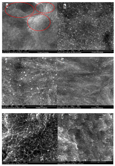 Nanocomposites prepared with non-functionalised MWNT in a PVDF matrix exhibit poor dispersion. From the SEM image in Figure 7a, severe agglomeration of nanotubes can be seen and is highlighted in the image by red circles. Due to high Van der Waals interactions, the nanotubes present are clustered together in the form of aggregates.