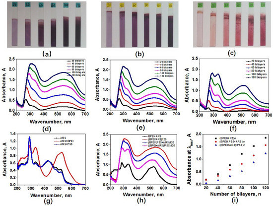 Photographs of (a) (BPEI/ARS)n, (b) (BPEI/(ARS+PSS))n and (c) ((BPEI+ARS)/PSS)n on ITO-coated glass; UV–Vis spectra of (d) (BPEI/ARS)n, (e) (BPEI/(ARS+PSS))n and (f) ((BPEI+ARS)/PSS)n on ITO-coated glass; (g) UV–Vis spectra of ARS, ARS+BPEI and ARS+PSS; (h) UV–Vis spectra of BPEI+ARS solution, (BPEI/ARS)120, (BPEI/(ARS+PSS))120 and ((BPEI+ARS)/PSS)120 on ITO-coated glass; (i) Relationship of the number of bilayers or layers pairs and the absorbance of the films at the maximum absorption wavenumber.
