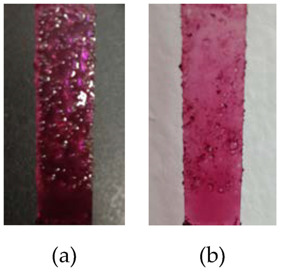 However, the color shade and color strength differed among the three assembly methods. ARS solution was orange yellow at pH 5, while (BPEI/ARS)n and (BPEI/(ARS+PSS))n films were dark purple, and ((BPEI+ARS)/PSS)n was peach red. The film colors were far from that of the ARS solution, which is mainly owing to the bathochromic effect of ARS’s interaction with BPEI. In addition, it can be observed that the (BPEI/ARS)n and (BPEI/(ARS+PSS))n films appeared much smoother even when the number of layer pairs was large; however, ((BPEI+ARS)/PSS)n films appeared rougher and rougher as the number of layer pairs increased. A special phenomenon of hydrogel formation was observed only during the assembly of ((BPEI+ARS)/PSS)n films (see Figure 3). When ARS was added to BPEI solution, physical crosslinking among BPEI molecules formed with ARS, which contains multifunctional groups. Then in LbL assembly, the crosslinked (BPEI+ARS) molecules adsorbed on the film, and then interacted with the adsorbed PSS to expand the spatial network, resulting in formation of the red hydrogel; after drying, the hydrogel collapsed into a film with a rough surface.