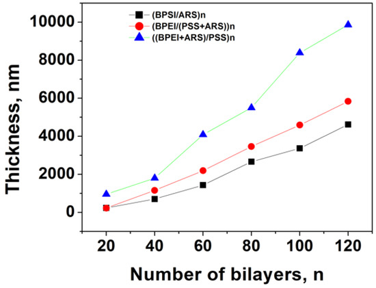 The thicknesses of the (BPEI/ARS)n, (BPEI/(PSS+ARS))n and ((BPEI+ARS)/PSS)n films were measured using a profilometer for when n was 20, 40, 60, 80, 100 and 120 (Figure 4). All three types of assemblies showed linear growth behavior, indicating suppressed interlayer diffusion throughout the multilayer films [64]. When the bilayer number was 20, the thicknesses of (BPEI/ARS)20, (BPEI/(PSS+ARS))20 and ((BPEI+ARS)/PSS)20 were 237, 226 and 955 nm, respectively; when the bilayer number increased to 120, the thicknesses of (BPEI/ARS)120, (BPEI/(PSS+ARS))120 and ((BPEI+ARS)/PSS)120 reached 4620, 5840 and 9860 nm, respectively. The thickness of ((BPEI+ARS)/PSS)120 was even double of that of (BPEI/ARS)120. The average layer pair thicknesses for (BPEI/ARS)120, (ARS/(PSS+ARS))120 and ((BPEI+ARS)/PSS)120 films were 38, 49 and 82 nm, respectively. The regular growth is attributed to the strong interactions among assembly species.