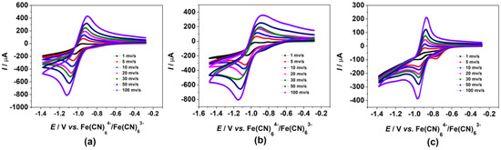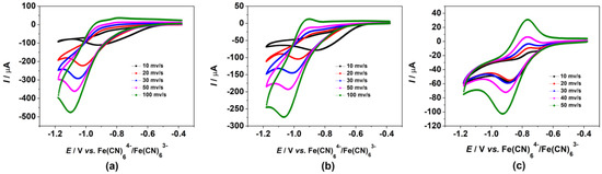 Cyclic voltammetry (CV) is a sensitive method for the characterization of anthraquinoids with regard to their electrochemical properties. In electrochemistry, anthraquinones exhibit a reversible 2-electron transfer process for its quinone/hydroquinone redox couple [66]. The two-electron reduction, depending on the availability of protons in the reaction media, can be accompanied by the uptake of two protons. In aqueous media, the reduction process is thus highly pH-dependent. As Milli-Q water was used, one hydroxyl group was present in dissociated form (Dye 2 in Figure 1), the reduction is likely accompanied by the uptake of one proton. (BPEI/ARS)120, (BPEI/(ARS+PSS))120, and ((BPEI+ARS)/PSS)120 films were subjected to CV over the potential range −0.38 to −1.18 V (vs. Fe(CN)64−/Fe(CN)63−) with different scan rates as shown in Figure 6. For comparison, CVs of ARS, ARS+PSS and ARS+BPEI solutions were also measured in Figure 7. The film-coated ITO glass or ITO glass was used as the working electrode (WE) vs. silver wire as the quasi-reference electrode (QRE) in 0.1 M NaCl against a platinum wire counter electrode (CE).