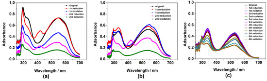 The electrochromic properties of (BPEI/ARS)120, (BPEI/(ARS+PSS))120, and ((BPEI+ARS)/PSS)120 LbL films were evaluated using spectroelectrochemistry, a method based on in situ collection of UV–Vis absorption spectra for electrodes held at a certain potential within a cuvette. Beginning at −0.38 V, the LbL films were in their original state (as shown in Figure 8, original absorption lines), presenting broad absorbance in the visible range for (BPEI/ARS)120 and (BPEI/(ARS+PSS))120, and much narrower absorbance for ((BPEI+ARS)/PSS)120. A linear voltage sweep began and the electrode potential became more cathodic; then, the in situ UV–Vis spectra were measured at −1.18 V (vs. Fe(CN)64−/Fe(CN)63−), representing the 1st reduction absorption curve (as shown in Figure 8). After measurement, a reverse linear anodic sweep began and then the spectra was recorded at −0.38 V (vs. Fe(CN)64−/Fe(CN)63−), representing the 1st oxidation absorption curve (as shown in Figure 8). The 2nd, 3rd and other reduction and oxidation absorption peaks in Figure 8 were obtained by repeating the above procedures.