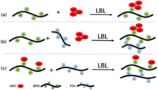 Schematics of LbL assemblies in this study: (a) (BPEI/ARS)n, (b) (BPEI/(PSS+ARS))n and (c) ((BPEI+ARS)/PSS)n.