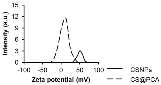 The zeta potentials of CSNP and CS@NP were measured on a DLS (Horiba SZ—100, Horiba Scientific Ltd., Kyoto, Japan). CSNP and CS@NP were dissolved in 10 mM PBS (pH 7.4, 1 mg/mL), then sonicated for 15 min, and measured at room temperature.