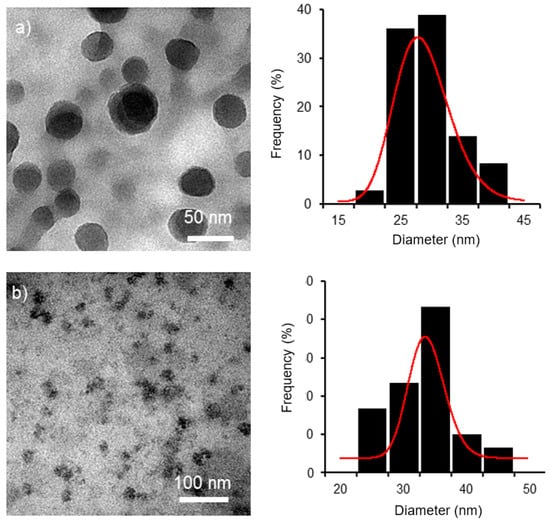 The TEM micrographs for CSNP and CS@PCA are shown in Figure 4. The results showed that CSNP had an average size distribution of 25–30 nm (Figure 4a) while the average nanometer size of CS@PCA was up to 30–35 nm (Figure 4b). This reveals that the particle size of CS was increased when they carried PCA molecules. This attribution of the increased size could be due to the successful bonding of PCA onto the CSNP surface. According to previous studies, particle size sufficient for good penetration into fungal cells was below 500 nm [27,28,29,30]. Thus, at this size, chitosan nanoparticles carrying PCA can fully interact on the cell membrane of the fungus, easily penetrate into the cell layer and destroy fungal cells.