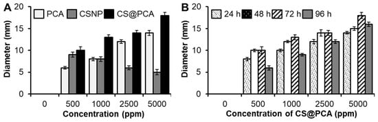(A) Diameter of inhibition zone of PCA, CSNP and CS@PCA based on various concentrations of PCA as 500, 1000, 2500 and 5000 ppm and (B) Diameter of inhibition zone of CS@PCA after various ranges of time: 24, 48, 72 and 96 h.