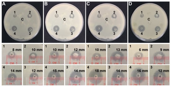 Diameter of inhibition zone of CS@PCA in 24 h (a); 48 h (b); 72 h (c) and 96 h (d) based on various concentrations of PCA as 0 ppm, 500 ppm, 1000 ppm, 2500 ppm, 5000 ppm (C = control, 1, 2, 3 and 4, respectively).