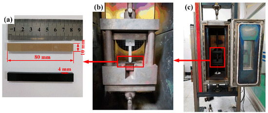 Quasi-static three-point flexural tests were performed using an electrical universal testing machine (Z020, Zwick/Roell) at a constant speed of 2 mm/min, according to ISO 178. Rectangular specimens with approximate dimensions of 80 mm × 10 mm × 4 mm were tested, and the span was 40 mm. The flexural behavior of PEEK and SCRF/PEEK were investigated over a wide range of temperatures from 20 to 235 °C. The specimens were kept at room temperature for three days before testing, and three samples were tested for each experimental condition. Figure 1a shows the dimensions of flexural specimens according to ISO 178. Figure 1b,c show the mold and test equipment.