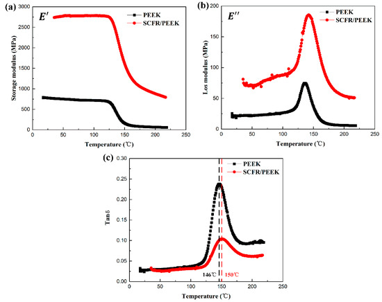 Dynamic mechanical analysis (DMA) results of PEEK and SCFR/PEEK composites: (a) the storage modulus () versus temperature; (b) the loss modulus ( ) versus temperature, (c) the tan δ versus temperature.