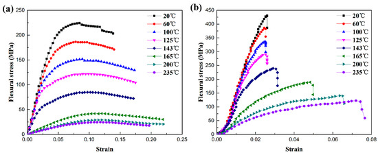 Flexural stress-strain curves of PEEK and SCFR/PEEK at various temperatures: (a) PEEK, (b) SCFR/PEEK.
