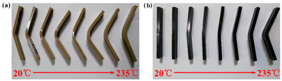 Flexural failure specimens of PEEK and SCFR/PEEK at various temperatures: (a) PEEK, (b) SCFR/PEEK.