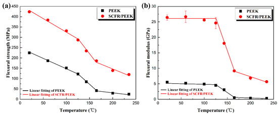 Relationship between flexural properties and temperature of PEEK and SCFR/PEEK: (a) Flexural strength vs. temperature; (b) Flexural modulus vs. temperature.