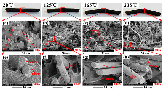 Figure 7 shows the SEM images of the fracture surfaces of SCFR/PEEK after flexural testing at various temperatures. In Figure 7a, the PEEK is in the glassy state at the ambient temperature of 20 °C and the brittle fracture of PEEK matrix is observed. In general, the addition of SCFs leads to embrittlement of the ductile polymers [33,34]. Besides, a strong fiber/matrix interaction is observed according to the fracture surface, as shown in Figure 7e. In Figure 7b, the PEEK is partial softening at the ambient temperature of 125 °C, and the brittle fracture and ductile fracture are both observed in the fracture surface. Besides, the interaction between fiber/matrix becomes weaker, as shown in Figure 7f. When the ambient temperature is higher than the Tg (150 °C), the PEEK matrix had changed completely from glassy state to rubbery state, and the ductile fracture of the matrix is clearly observed in Figure 7c,d. Of course, the interaction between fiber-matrix is weak and there is no matrix coated on the pullout SCFs, as shown in Figure 7g,h.