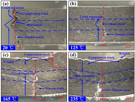 Figure 8 shows the micrographs of flexural failure specimens at various temperatures. In Figure 8a, it can be observed that the specimens tested at room temperature have brittle fractures. The tension crack, shear crack and compression crack occur in the lower surface, the core area and the upper surface, respectively. The crack expansion is instantaneous and catastrophic. In Figure 8b, the brittle and ductile are both observed in the fracture surface at the temperature of 125 °C. The brittle tension crack occurs in the upper surface and the shear crack occurs in the core area. However, the ductility of matrix caused by the increase of temperature prevents the further expansion of the crack, and there is no compression crack on the upper surface. In Figure 8c,d, it can be observed that the specimens tested above Tg are ductile fracture. The tension crack in the lower surface and compression crack in the upper surface both occurs, and there is no shear crack occurred in the core area. The tension crack will decrease but the compression crack increases as the ambient temperature is raised. Besides, the compression wrinkles and cracks occur on both sides of the axis.