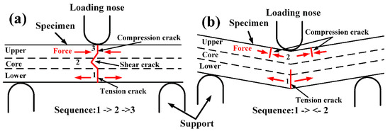 In the three-point flexural test, there are three different crack types in the interior of the specimens: compression crack in the upper surface, tension crack in the lower surface and shear crack in the core area [10], as shown in Figure 8 and Figure 9. At room temperature, according the Figure 8a,b, it can be speculated that the tension crack (#1) in the lower surface occurs first. With further loading, the crack extends upward, with the result that the shear crack (#2) occurs in the core area and compression crack (#3) occurs in the upper surface, as shown in Figure 9a. This is mainly because the compression failure strength of SCFR/PEEK composites is higher than the tension failure strength [1]. This conclusion is inconsistent with the conclusion of reference [10]. They explained that compressive cracks occurred first and the tension crack then initiated from the tension side, met with the lower shear crack near the core region, and resulted in catastrophic failure. In addition, the compression cracks away from the contact zone are almost vertical crack along the axis. At high temperature (above Tg), according the Figure 8c,d, the tension crack (#1) in the lower surface and the compression crack (#2) in the upper surface both occurs, and the strong ductility of matrix at the high temperature prevents the generation of shear cracks, as shown in Figure 9b. Besides, the compression cracks occur on both sides of the axis and perpendicular to the upper surface. Since the matrix is in a rubbery state and has a strong toughness, the SCFR/PEEK composites will destroy after a certain deflection, and the force exerted by the loading nose and supports meets near the axis, resulting in wrinkles and cracks.