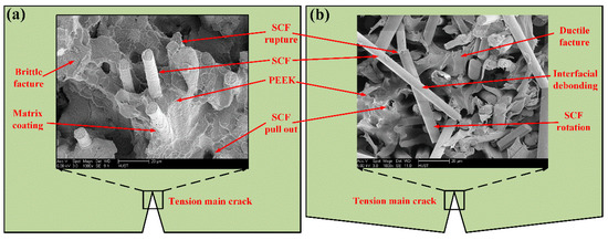 Figure 10 is the SEM of SCFR/PEEK composites depicting the flexural fracture mechanisms with the process zone ahead of the main tension crack at room temperature and high temperature. In Figure 10a, it can be observed that the matrix is brittle fracture at room temperature. When the crack is expanding, the rotation of SCFs will be restricted by the brittle matrix and strong fiber/matrix interaction. Therefore, the fracture of SCFR/PEEK composites is mainly due to the rupture and extraction of SCFs. In Figure 10b, it can be observed that the matrix is ductile fracture at high temperature (above Tg). The softening of matrix weakens the interaction between fibers and matrix, which makes the SCFs easy to rotate and pulled out when the crack is expanding. Therefore, the fracture of SCFR/PEEK composites is mainly due to the rotation and extraction of SCFs, while the SCFs rupture plays a minor role.