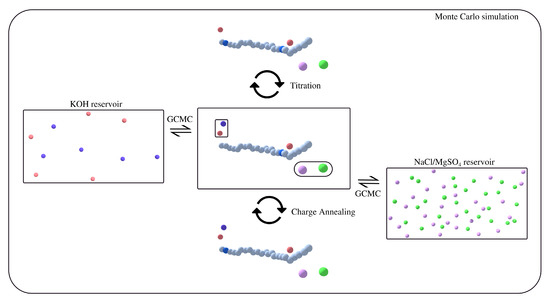 Schematic of the Monte Carlo moves utilized in our simulations. The color scheme is as follows: light blue and dark blue beads represent uncharged and charged monomers; red and purple beads represent K and OH ions; and pink and green beads represent Na and Cl. The KOH and NaCl or MgSO reservoir are representative of bulk concentrations whereas the concentration within the simulation box is representative of the environment around the weak polyelectrolyte in the combined system. KOH concentration in the reservoir or bulk concentration is fixed at 0.002 M which corresponds to pOH ≈ 2.7 whereas the salt bulk concentration is considered here as a variable. The salt bulk concentration depicted in this schematic corresponds to ≈0.01 M. Titration moves charge the monomer bead, as defined in the governing reaction (Equation (6)). Charge annealing moves simulate the equilibrium dissociation and recombination of the monomer bead in another location on the polymer, while grand canonical Monte Carlo (GCMC) moves govern the exchange of ions with the bulk.