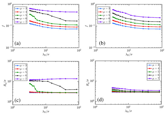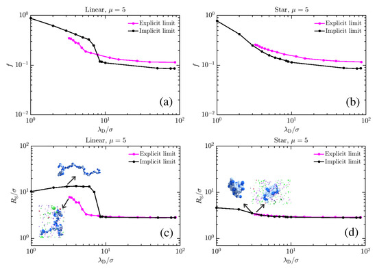 First, we analyze the charging of the linear and star weak polyelectrolyte in the implicit and the explicit limit. Figure 3a,b depict the charging behavior (characterized by the fraction of charged monomers f), while Figure 3c,d plot the radius of gyration () for these polyelectrolytes at = 5. Two major effects are notable. First, the star suppresses charging in both cases relative to the linear polyelectrolyte, and with it, suppresses swelling. This is perhaps unsurprising, as the topological constraints enforced by the central bead signify that there is significantly less entropy available to the swollen polyelectrolyte, which shifts the free-energetic balance toward enthalpically favorable adhesion. Second, the explicit ion representation, which initially favors enhanced charging (with ≳10% of monomers charged at all ), actually suppresses charging in both cases for both the linear and star polymers. This may also be understood by appealing to entropic ideas [29,80,81,82,83,84,85,86,87,88]. In this case, the ion entropy is strongly limited when it penetrates the collapsed core of the weak polyelectrolyte in order to take advantage of enthalpically favorable charge interactions, themselves favored due to the value of [44]. Adhesive interactions alone are insufficient to collapse the polyion, as evidenced by the swelling of the implicit salt case, suggesting that entropy plays a significant role in determining the state of the polyelectrolyte. This is further corroborated by examining the similarity between the charging and swelling behavior of linear chains and stars in the explicit salt case. The charging curves are remarkably similar until sufficient numbers of ions exist in the system to unlock the polyelectrolyte chain, which happens for on the order of the monomer diameter. Linear chains, which can gain more entropy, will swell, while stars do not exhibit significant swelling. This points to a more complex tug-of-war between different influences on the CGT of weak polyelectrolytes than the Debye-Hückel picture can capture. Notably also, while the Debye-Hückel version of the model has a re-collapse at very high monovalent salt concentrations [45,46,47]. we do not see any evidence that this will occur with explicit salt. Indeed, we do not expect it, as it is entropically unfavorable for sufficient numbers of co- and counter-ions to occupy the region around the polyelectrolyte and meaningfully screen charged monomer interactions. The behavior of explicit-salt simulations is thus more similar to what has been observed in experiment [49,66,89].