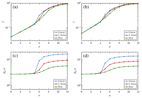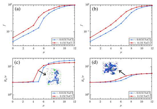 Figure 3 suggests that important thermodynamics affecting the charge and conformation of weak polyelectrolytes are missed within the implicit-salt representation. It is important, then, to understand how mutual variation of and salt concentration manifest in the physical state of weak polyelectrolytes. Knowing this, we proceed to explore how the charging behavior of linear and star polyelectrolyte is affected due to the variation of in our explicit-salt representation. In Figure 4 a–d, we show the effects of varying at fixed NaCl concentrations, demonstrating a clear preference for increased charging and swelling of the polymer conformations at larger for both linear chains (a,c) and stars (b,d). The effects of topology are fairly strong here, and visible in both curves. While a sharp transition from a collapsed to an expanded state (and concomitant jump in charge fraction f) occurs for the linear chain, the star is unable to dramatically swell and thus exhibits only a gradual increase in its charge and size. The character of the CGT is thus strongly affected by the confinement, as was previously noted for studies on implicit-salt systems [45]. The effect of increased salt concentrations is to facilitate charging, which in turn facilitates swelling of the chain at small , though due to screening effects, swelling is enhanced at low salt concentrations; this is more pronounced for the chain (Figure 4c) than for the star (Figure 4d). Overall, increases in the monovalent salt concentration provide a favorable charging environment (evidenced by the shifting of the CGT transition to lower ) but limit the extent of swelling. Related results in Figure 5 demonstrate variations in charging behavior for star polymers with different numbers of arms and equal molecular weight. Note that both the charging and swelling behavior of 5-arm stars is between that seen for the linear and 10-arm cases, with a CGT transition that is more gradual (though still reasonably sharp) due to topological restrictions. While the extent of swelling is limited, the additional entropy afforded the 5-arm stars yields curves for f with varying that are closer to those observed for the linear polyelectrolyte.