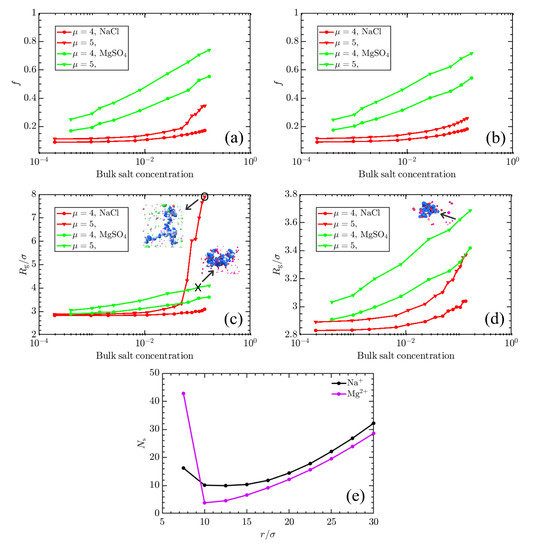 Some significant conclusions can be made from the results presented in Figure 7. First, the linear weak polyelectrolyte undergoes the CGT with increasing concentration of monovalent salt such as NaCl at intermediate values, but this does not happen for multivalent salt even though the observed charge f is higher with MgSO present. Secondly, the topology of the weak polyelectrolyte (see Figure 7b,d) does not play a role in the charging behavior with MgSO, likely because swelling is not pronounced for these systems. Neutralization via divalent counterions has been known to result in collapsed or lower structures [94,95,96,97], which explains why globular structures are indicated even at conditions of high polymer charge in the presence of MgSO in Figure 7. The distribution of counterions shown in Figure 7e corroborates this, showing a high concentration of MgSO counterions near the polymer () suggesting divalent counterion condensation on the polymer chain, contributing to neutralization and collapse. This phenomenon of increased ionization of the weak polyelectrolyte along with condensation of the divalent counterion on the polymer chain was also observed in work done by Qu et al. [66], where ionization along with SO condensation on P2VP chains was reported. In the case of NaCl, a comparatively diffuse distribution is seen, with ions acting primarily to screen the charge. This behavior of weak polyelectrolytes depicted here in the presence of divalent salt could be particularly useful for adhesion of polymers in hydrogels and can offer more tuning opportunities for targeted drug delivery [96,98,99,100,101,102].