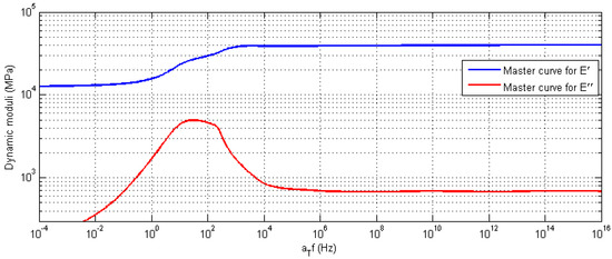 Assuming the linear thermoviscoelasticity in many industrial polymers that are used for construction purposes as well as matrices of PMCs, the behavior of such materials can be described by so-called master curves, which represent the dependency of a mechanical property (e.g., moduli) on a temperature and loading frequency. The construction of a master curve is based on the Arrhenius relation (or its modified version presented in [17]), and the time–temperature superposition principle. Detailed information on the measurements and further calculations necessary for the construction of master curves can be found in [17,18,19,20,21]. An example of such a master curve is presented in Figure 3.
