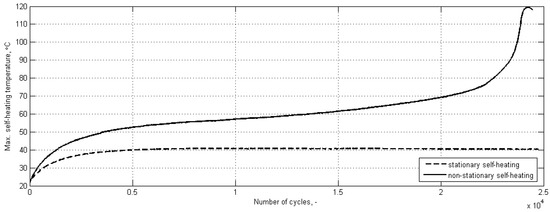 This means that the self-heating temperature remains constant for a prolonged period. This stabilization is reached, due to the equilibrium between the generated thermal energy as a result of self-heating, and the thermal energy convected and radiated to the environment. A self-heating scenario depends on the level of applied stress. In the case of exceeding the critical level of the applied stress (which is usually on the level of 50–85% of the total fatigue life, depending on material and loading parameters [8,34,35,36]), the thermal equilibrium does not occur, and the second phase is characterized by a slope, but retains linear characteristic (see Figure 4). The self-heating effect in such a case follow the non-stationary scenario, and the appearance of a slope on the temperature history plot in the second phase is a result of mechanical degradation of a structure [6], which, in the end, results in the progressive development of damage in the form of voids and microcracks [37,38,39]. When these microcracks accumulate, the macrocrack appears, which in fact, ends the second phase of self-heating and initiates the third phase. This phase is characterized by a rapid character of development, since the process is dominated by the frictional heating in a macroscopic sense, i.e., the newly appeared surfaces in a propagating crack start to slide on each other under cyclic loading, which results in a rapid increase of a resulting temperature. In the case of the appearance of the third phase in non-stationary self-heating (called also the “thermal catastrophe” [40]), the resulting self-heating temperature values often reach or even exceed the glass-transition temperature of the polymers or polymeric matrices of PMCs [6,41,42,43]. The above-described three-phase model of non-stationary self-heating was mentioned in many other studies [8,26,38,44,45,46,47,48,49,50,51,52].