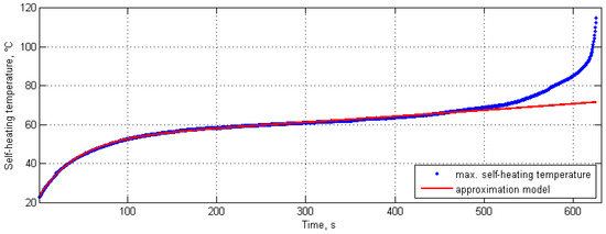 The self-heating effect may follow two physically possible scenarios: a stationary and a non-stationary one [32], which leads to mechanical and thermal fracture, respectively [33]. In the case of stationary self-heating, the self-heating temperature profile has two phases: the first phase of exponential character, governed by the second law of thermodynamics, and the second phase, when self-heating temperature stabilization occurs (see Figure 4).