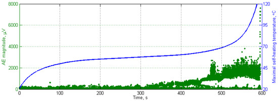 Representative acoustic emission (AE) response with the self-heating temperature history curve.