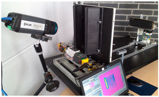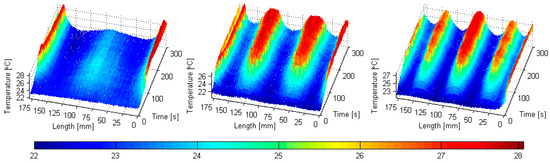 Since the temperature measurements revealed good sensitivity to structural changes in a material, the evaluation of the self-heating effect criticality was supposed to be effective, based on the analysis of the thermodynamic processes appearing during self-heating. For this reason, numerous methods were used for the determination of the critical self-heating temperature. One of the approaches was based on the evaluation of differences of the thermal diffusivity of healthy and damaged regions of a PMC structure subjected self-heating [137]. The tested specimens were prepared on the laboratory test rig presented in Figure 5 in such a way that loading was applied until reaching a specific temperature value on its surface (since self-heating temperature distribution is non-uniform—see Figure 2 for instance—the maximal value of the self-heating temperature was considered). Due to the fact that specific temperature values can be related to a degree of structural degradation, by tabulating maximal self-heating temperature values, a set of specimens with various degree of degradation was obtained. The specimens prepared in such a way were then subjected to pulse heating using the test rig presented in Figure 8, which was used for the uniform heating of a specific region of a specimen by an IR radiator (see [137] for details). The thermal response was registered by an IR camera.