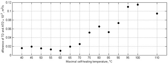 The resulting thermograms were used for the determination of thermal diffusivity following the method presented by Parker et al. [139]. The relative apparent thermal diffusivity (ATD) was determined as follows: thermal diffusivity (TD) was evaluated for a healthy region, and a damaged region (called here the apparent thermal diffusivity, since the thermal diffusivity was determined for a PMC structure and air in gaps resulting from fracture). The relative ATD defined in [137] was then calculated as the difference between the TD and ATD. The obtained results for the difference between healthy and damaged regions for particular specimens with various degree of degradation due to self-heating are presented in Figure 9.
