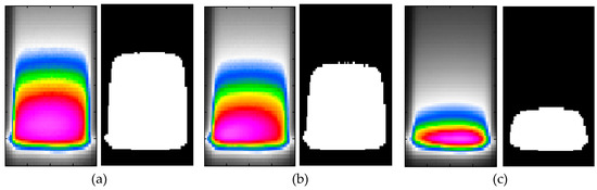 The next approach of determination of the critical self-heating effect was based on the analysis of the variability of temperature distribution during cyclic loading, which changes the heated area due to the formation of a macrocrack at the beginning of the third phase of self-heating [143]. The changes of a heated area are connected with the structural degradation and the redistribution of stress—during the formation of a macrocrack, stress concentrates on this crack, while at more distant regions from a clamp, the stress become lower, accordingly. Such a phenomenon can be observed from a comparison of the distribution of temperature at different stages of degradation (see Figure 11). In this figure, three pairs of images representing the degradation evolution are presented: in each pair, the first image is a thermogram, while the second one is its binarized version obtained by a squeezing operation on the red color channel, and then subjected adaptive thresholding.