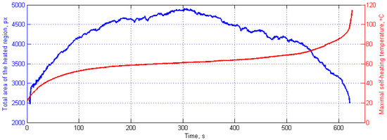 The evolution of a total area of a heated region with the corresponding maximal self-heating temperature history.