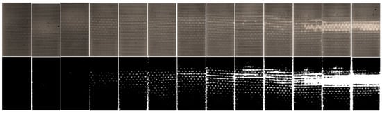 A set of specimens prepared in the same way as for the thermal diffusivity tests described above was subjected to microscopic testing in order to analyze surface cracks at various stages of degradation. The results of these studies were described in [39,132]. The criterion for the determination of the critical self-heating temperature value in this approach was based on the analysis of evolution of a crack density parameter, calculated as the number of cracks per unit of area [144] for specimens with various degrees of degradation. Before the determination of crack density, the obtained microphotographs were pre-processed by using unsharp masking (for sharpening) and global image thresholding (for binarization). The obtained binary images were normalized in order to obtain dimensionless crack density measures. The selected results of the original and pre-processed microphotographs are presented in Figure 13, which show the evolution of a degradation of PMC specimens subjected to self-heating.
