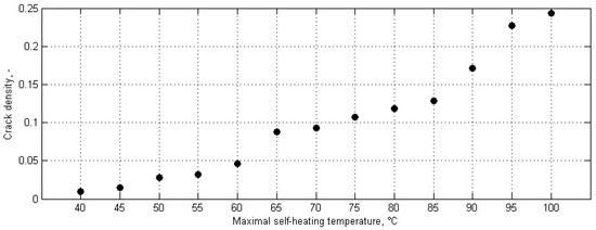 From the visual analysis, one can observe the formation of a through-the-width crack (which can be considered as a macrocrack) at ca. 70–75 °C. In order to obtain quantitative results, the determined crack density parameter was plotted vs. the maximal self-heating temperature, and a sudden change of a value of the crack density parameter was assumed as a criterion of the criticality of self-heating (see Figure 14). In this plot, one can observe the non-monotonic increase of a crack density parameter at 65 °C, which indicates abnormal structural changes, i.e., starting of progressive cracking. According to these results, the mentioned corresponding temperature was assumed as a critical self-heating temperature in this approach.