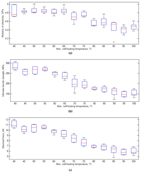 The criticality of self-heating was also determined in destructive tensile quasi-static tests, which were performed on a set of specimens with variable degradation degrees prepared in the same way as for the thermal diffusivity tests [132]. Three parameters were determined in this study: residual elastic modulus, ultimate tensile strength, and maximal force at failure. The results of these tests presented vs. the maximal self-heating temperature are shown in Figure 15 in the form of bar plots, where the central marks denote median values obtained from five tests of specimens with same degradation degree, while the upper and lower edges of the boxes are the 25th and 75th percentiles, and the whiskers extend to the most extreme data points.