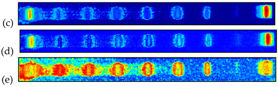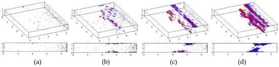 In order to investigate the fracture mechanisms occurring during the fatigue of PMCs accompanied with deep self-heating, and to analyze their influence on the criticality of a degradation process, an additional study was performed on a set of specimens with various degrees of degradation, prepared in the same way as the previous usage of X-ray Industrial Computed Tomography (ICT) [145]. The X-ray ICT tests allowed for 3D representations of fractured specimens to be obtained, and observation of the initiation of cracking due to self-heating. The collected tomograms were subjected to pre-processing, in order to prepare them for further analysis by using the developed image processing procedure, which covered the application of a Gaussian filter and adaptive thresholding, based on the mean of the local intensity distribution. Next, the texture-based segmentation algorithms were applied in order to identify and classify cracks and delaminations. The selected results of the processed tomograms are presented in Figure 16. The full set of processed tomograms can be found in [145].