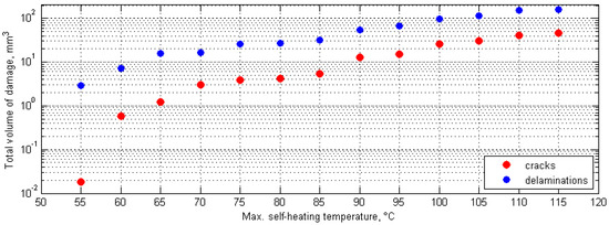 Analyzing the results of the X-ray ICT study, one can observe a rapid increase in the total volume of cracks at 60 °C of the maximal self-heating temperature, which was caused by the initiation of structural degradation. Below this value of the self-heating temperature, the total volume of cracks was on the level of scanning and processing errors, while delaminations were undetectable. This allows for an assumption that the value of 60 °C could be considered as the critical self-heating temperature in this study. This value was also confirmed in morphological analyses performed by using a scanning electron microscope (SEM) on the same specimens [146].