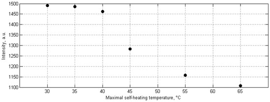 Intensity of Raman epoxy band (1256 cm−1) for various self-heating temperature values.