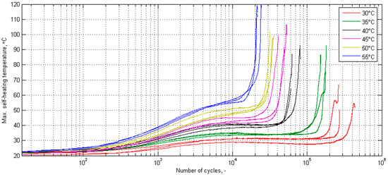 Extensive studies on the evaluation of the criticality of the self-heating effect described in the previous subsection need to be summarized, in order to evaluate the most sensitive methods for the determination of this characteristic temperature, as well as to define safe self-heating temperature ranges, which allow for the operation and non-destructive testing of polymeric and PMC structures. The newest studies focused on the evaluation of the influence of the self-heating temperature on the residual life of such structures indicated that even a small increase of a self-heating temperature may influence the residual life of a structure significantly [149]. The performed experiment assumed the cyclic loading of PMC specimens, with various loading force values adjusted in such a way that the self-heating temperature on the surface stabilized onto a certain value. The results of this study are presented in Figure 19. One can observe that a temperature values increase from 30 °C to 33 °C may shorten the residual life of a PMC structure by two-fold or more, which was confirmed both by the analysis of a thermal response, as well as an AE response [32,149].