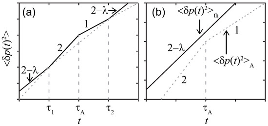 Sketches of MSDs for a simple probe in a viscoelastic media at double-logarithmic scales. The active noise with (a) strong , or (b) weak magnitude, respectively. The same parameters as those in Figure 1 are adopted.