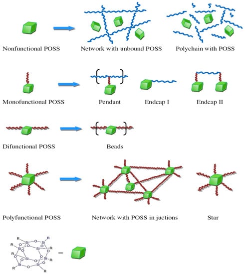 Polyhedral oligomeric silsesquioxanes (POSS) form a class of nanostructured materials having diameters on the order of 1–3 nm; they can be considered as the smallest silica nanoparticles (NPs) [1,2,3,4]. Polyhedral oligomeric silsesquioxanes (POSS) moieties have the empirical formula (RSiO1.5)n, where R may be an organic functional group (e.g., alkyl, alkylene, epoxide unit, acrylate, hydroxyl) or a hydrogen atom, controlled porosity and nanometer sized structure; the structures of POSS NPs can be divided into partial cage, ladder, and random structures [5,6,7,8,9]. The properties of POSS-containing polymers can improve (e.g., decreased flammability, viscosity, and heat discharge, and increased rigidity, strength, and modulus) via the degree of dispersion of the POSS NPs into the polymer matrix [10,11,12,13,14,15,16,17,18,19,20,21,22,23,24,25,26]. Two general approaches have been used to incorporate POSS units into polymer matrices: (i) physical blending [27,28,29,30] and (ii) covalent attachment [29,30,31,32,33,34,35]. In the physical blending approach, the POSS NPs are blended (through melt-mixing or solvent-casting) with the polymers without forming covalent bonds; the success of this approach depends on the compatibility of the POSS NPs with the polymers [36,37,38]. In the covalent approach, the POSS NPs are attached to the polymer chain through covalent bonds. Although many types of POSS NP architectures (non-functional, mono-functional, bifunctional, and multi-functional) have been incorporated into polymer matrices (Figure 1), the preparation of polymer/POSS nanocomposites remains challenging because it can be expensive to perform on large scales, can require long equilibrium times, and can result in aggregation of the POSS NPs [39,40,41,42,43].