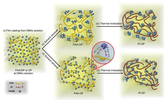 Wei et al. [76] prepared nanoporous PI/POSS nanocomposites through a multistep process (Figure 6). First, pyromellitic dianhydride (PMDA) reacted with 4,4′-oxydianiline (ODA) in DMAc under a N2 atmosphere at room temperature to afford PAA. Then, POSS-NH2 reacted with PAA in DMAc to obtain PAA/POSS nanocomposites. The PI linked through its chain ends to POSS NPs was obtained after thermal imidization of the PAA/POSS nanocomposites at 300 °C. The dielectric constant of the resultant polyimide POSS nanocomposites decreased from 3.40 for the neat PI to 3.09 after adding 2.5 mol % of POSS units; this behavior was attributed to the phase-separated system and the uniformly porous structure (nanometer-scale) of the POSS molecules. In addition, the resultant PI linked through its chain ends to the POSS NPs formed lamellae or cylinders that were in the range of 60–70 nm long and 5 nm wide (through transmission electron microscope (TEM) image).