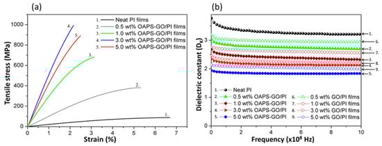 (a) Stress–strain curves of neat PI films and OAPS-GO/PI films with different contents of various amounts of OAPS-GO. (b) Profile dielectric constants of neat PI films, GO/PI films, and OAPS-GO/PI films [74]. Reproduced with permission from the American Chemical Society.